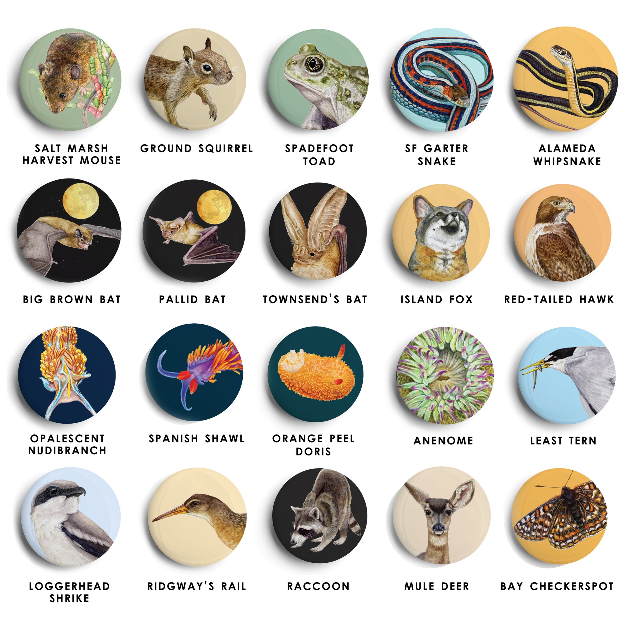These magnets are 1.25" with reproductions of my original watercolor illustrations inspired by these native California plant, animal, and fungi species.