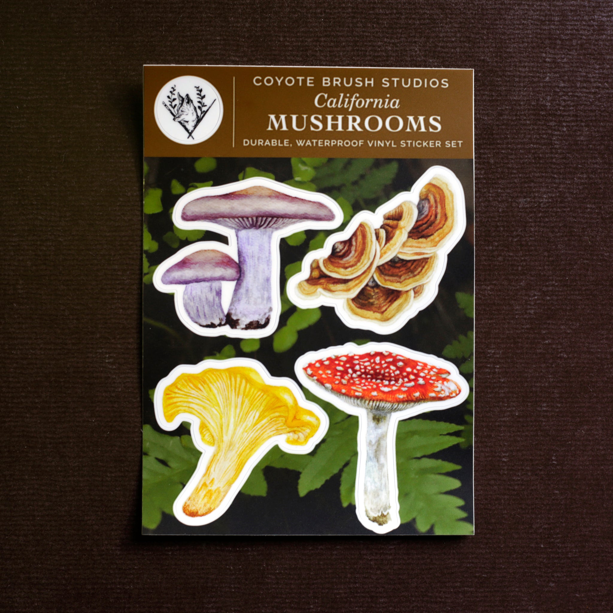 These stickers are reproductions of my original watercolor illustrations inspired by these native California mushrooms. Apply them to a notebook, water bottle or anything that could use an extra California touch!