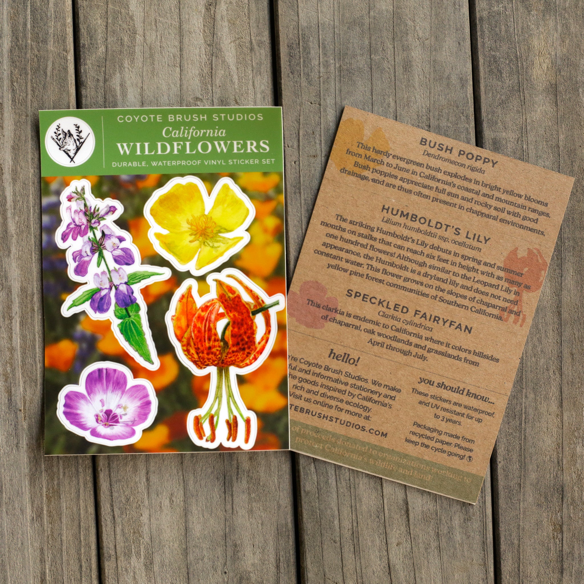 Packaging is made from 100% recycled materials and includes fun facts about these native California species. Your stickers will be mailed in a 100% recycled mailer.