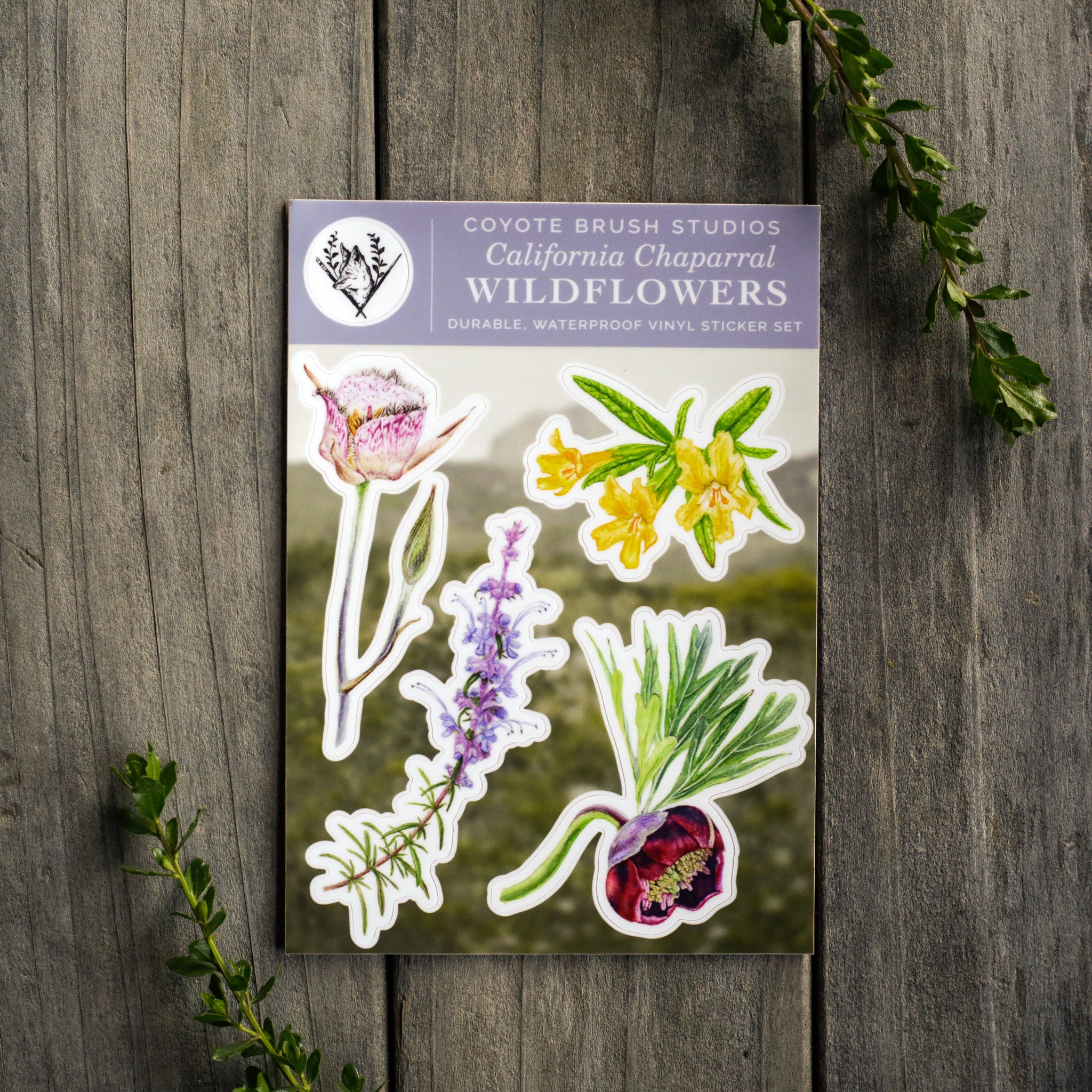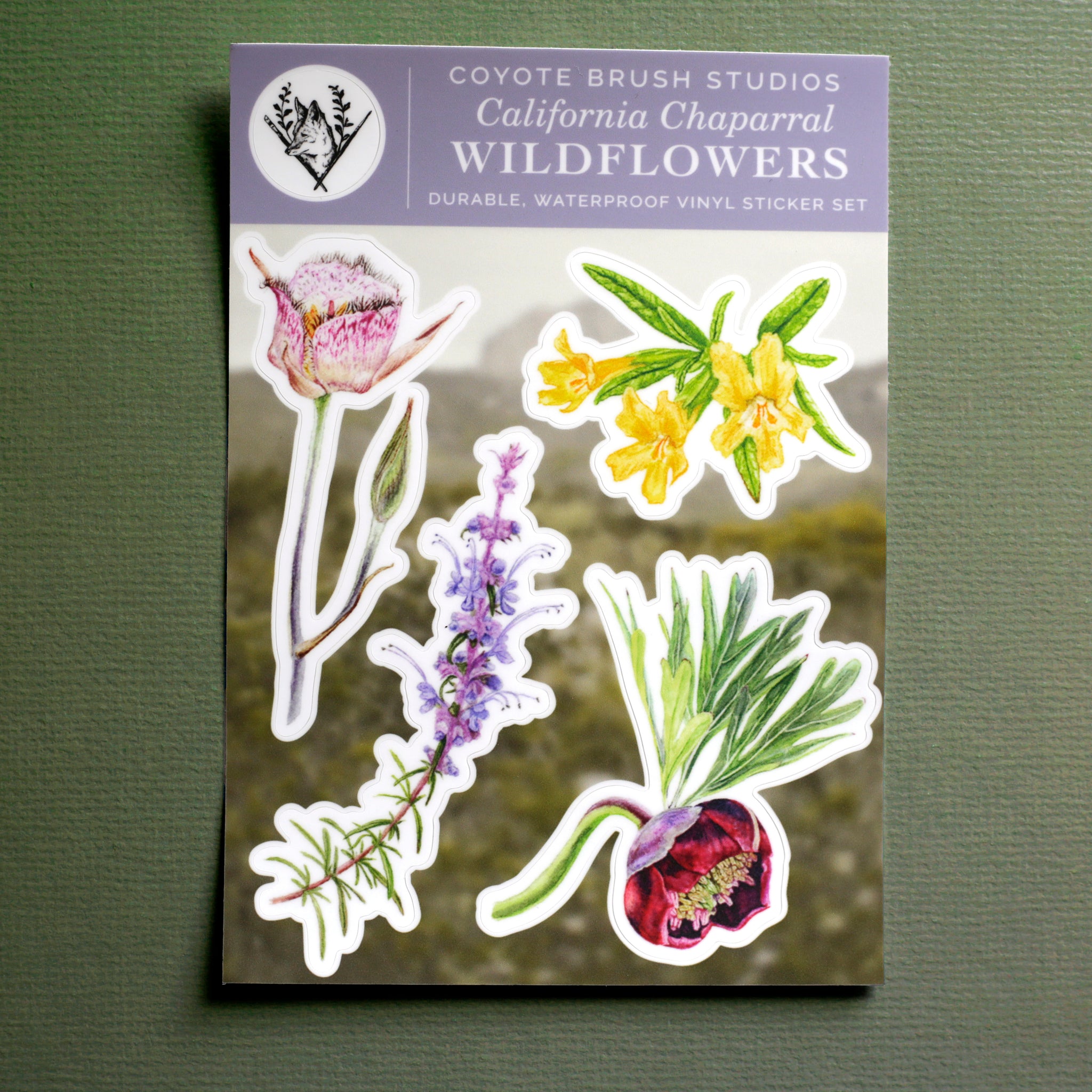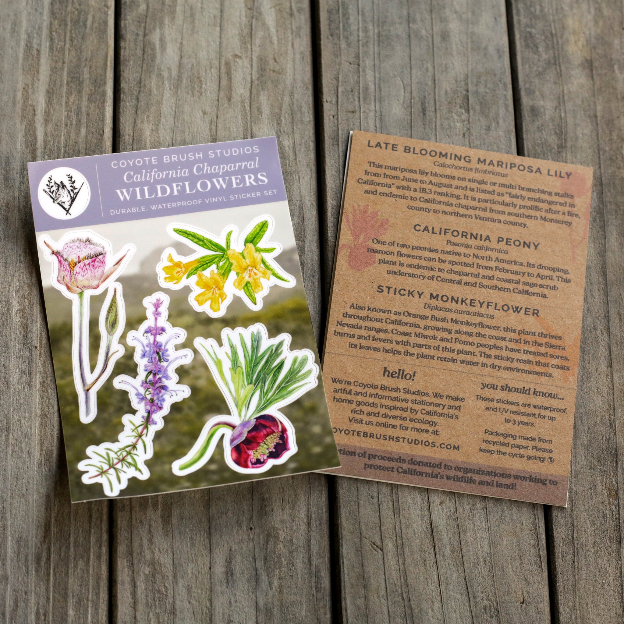 This sticker sheet includes four stickers of wildflowers found in chaparral habitats, perfect for any naturalist (young or old), chaparral enthusiast, native plant fan, or lover of nature illustration.