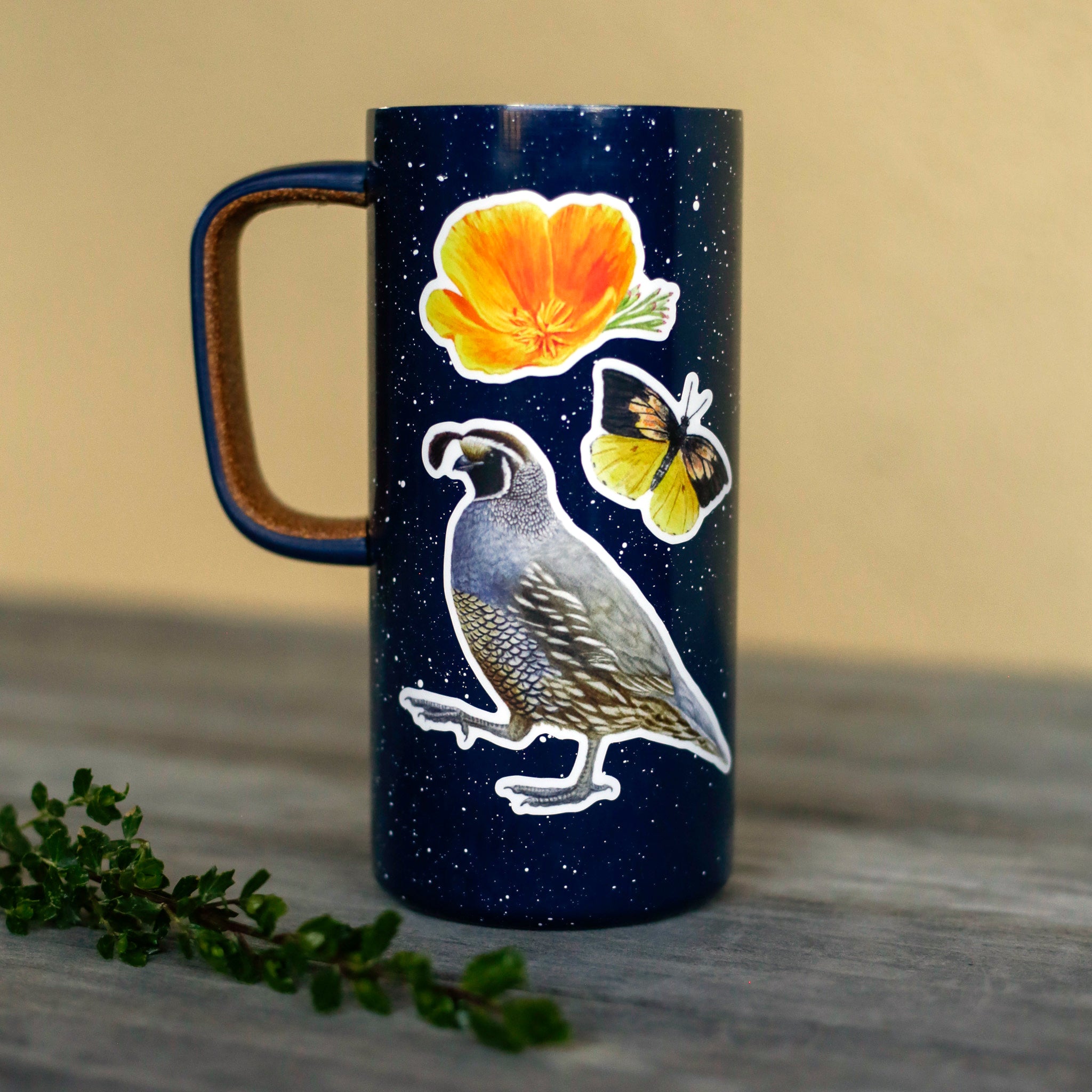 This sticker sheet includes four stickers of some of California's most iconic state symbols, including the Poppy and Quail, as well as CA Dogface butterfly. These stickers are perfect for any naturalist (young or old), or lover of nature illustrations or of California.