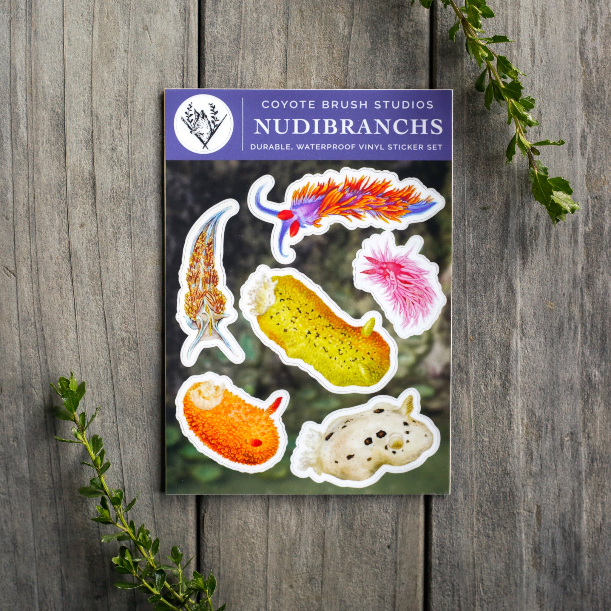 This sticker sheet includes six nudibranchs found in California, perfect for any naturalist (young or old), or lover of nature illustrations or of tide pooling along the Pacific coast.